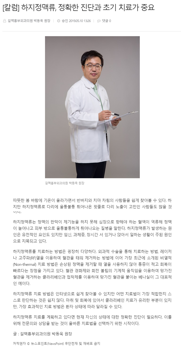 [칼럼] 하지정맥류, 정확한 진단과 초기 치료가 중요 페이지 정보 작성자 길맥흉부외과의원 댓글 0건 조회 2,381회 작성일 19-05-10 16:25 목록 본문 이전글박동욱원장님 "KNN 건강365" 출연 안내 19.08.16 다음글[기사] 하지정맥류, 환자와 개개인의 원인, 증상에 맞는 치료법으로 접근해야 19.05.10 댓글 0 댓글목록 등록된 댓글이 없습니다.
