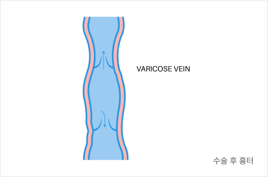 일반적으로 하지정맥류는 다리의 표재정맥이 역류로 인해 증가된 압력 때문에 풍선처럼 부풀고 뱀처럼 구불구불해지는 변화를 일으킨 상태를 말합니다. 증가된 정맥압력은 정맥 주위에 저산소증과 염증을 유발하게 되고 결국엔 정맥고혈압으로 진행되어 증상과 합병증이 나타나게 됩니다.